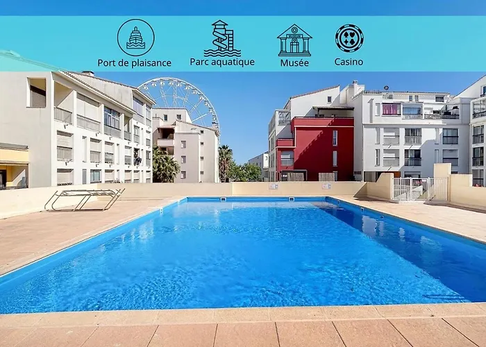 Studio Confortable Avec Climatisation Au Cap D'Agde Avec Port, Plages Et Nature Accessible A Pied med 1 sovrum, som ligger 3 km från La Baie des Pirates, erbjuder en privat pool.